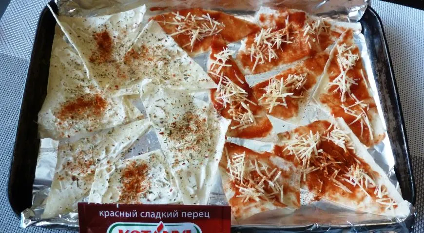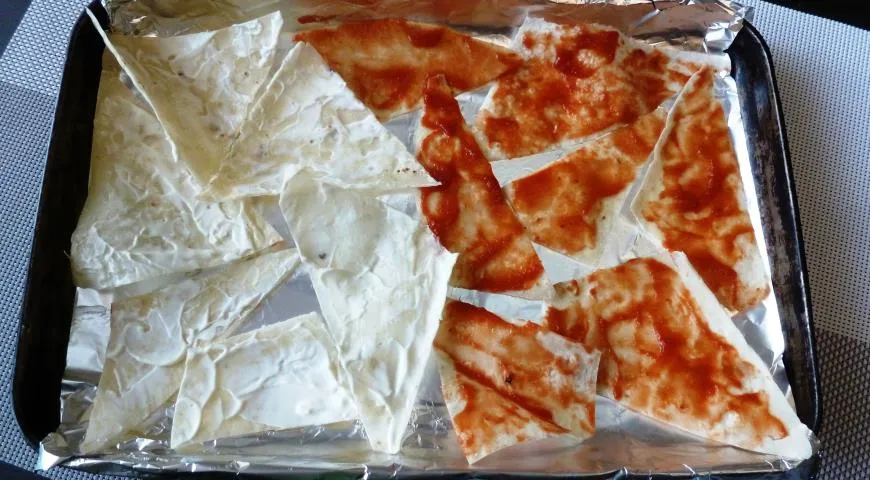 На противень постелем фольгу, на фольгу разложим кусочки лаваша. Часть кусочков смажем кетчупом, а вторую часть майонезом.