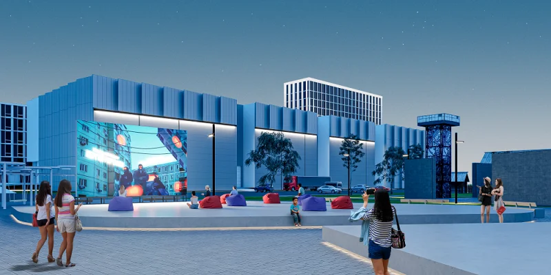 Архитектурный образ продуман до мелочей и основан на узнаваемых визуальных кодах: фасады отсылают к северному сиянию и движению кинопленки, формируя живой световой градиент и ритмичный орнамент. Так «База 14» превращает будущий павильон не только в производственную площадку, но и в символ креативного развития региона.